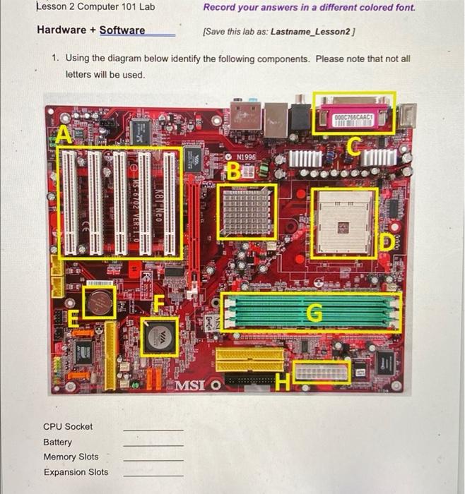 Understanding Motherboard Parts and Functions - Udemy Blog Motherboard components and functions. Standard components are installed on close to two dozen slots on the motherboard for basic computer operations. Here's a breakdown of the most critical: CPU socket. This is where the central processing unit (CPU) is installed. This center of the motherboard is the computer's "brain," where data is ... Picture Of Motherboard With Label / Label The Motherboard Labelled ... Find over 100+ of the best free motherboard images. The computer motherboard comprises components crucial to the functioning of a computer. Shipping a package with ups is easy, as you can print labels for boxes, paste them and even schedule a pickup. Motherboard, computer literacy, computer basics . Motherboard diagram with all components labeled. Motherboard Components And The Functions Explained 6. Floppy controller: The floppy drive connects to the computer via a 34-pin ribbon cable, which in turn connects to the motherboard. A floppy controller is one that is used to control the floppy drive. 7. IDE controller: Industry standards define two common types of hard drives: EIDE and SCSI. Majority of the PCs use EIDE drives. Day 2 - Motherboard Labels.docx - Challenge Lab Computer Motherboard ... Challenge Lab Computer Motherboard Components Directions: Label the following components from below on the diagram above and then give a description of what each component does PCI Slot - PCI-E 16x SlotPCI-E 16x Slot -