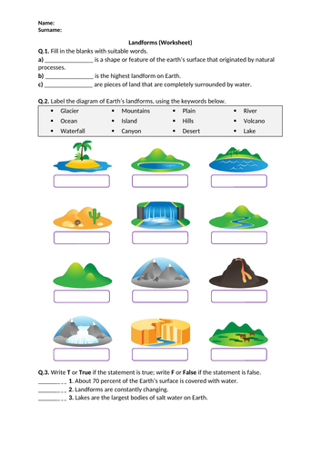 Major Landforms of the Earth Class 6 - Leverage Edu Landforms are the physical features on the outer layer of the earth, i.e. its surface. The earth's landforms take their actual shape naturally through various processes such as weathering, sinking, soil erosion, elevation, water etc. The major landforms of the earth are Mountains, Plateau and Plains. The process of formation of these surfaces ... Landforms For Kids Philippine Landforms Facts, Worksheets, Mountain & Ranges For Kids Information for kids K - 6 about some significant natural geographical features of Australia's ... labeling, matching, landforms vocabulary accompanied by simple, comprehensive definitions and charts give a vivid understanding of the concept to kids of grade 1 through grade 4. Tag Question Worksheet : English Exercises Question Tags This section is full of worksheets that can help your students practice forming and using tag questions. In the first exercise, students match question tags to sentences to make tag questions. A) auxiliaries like be, have, can, may, must, should, etc. Worksheets, handouts, printable exercises pdf. LANDFORMS - Travelling across time / Viajando a través del tiempo LANDFORMS_-action. types of landforms. WORKSHEETS TO PRACTICE: CROSSWORS Landforms. earth-science-crossword-landforms. crossword-on-landforms. 5th-Grade-Crossword-Water-Landforms1. Match every landform or body of water with its definition. Label La ndforms using the word bank below. landform-fitb_WMWRQ. landform-definitions_WMWRF. landform ...