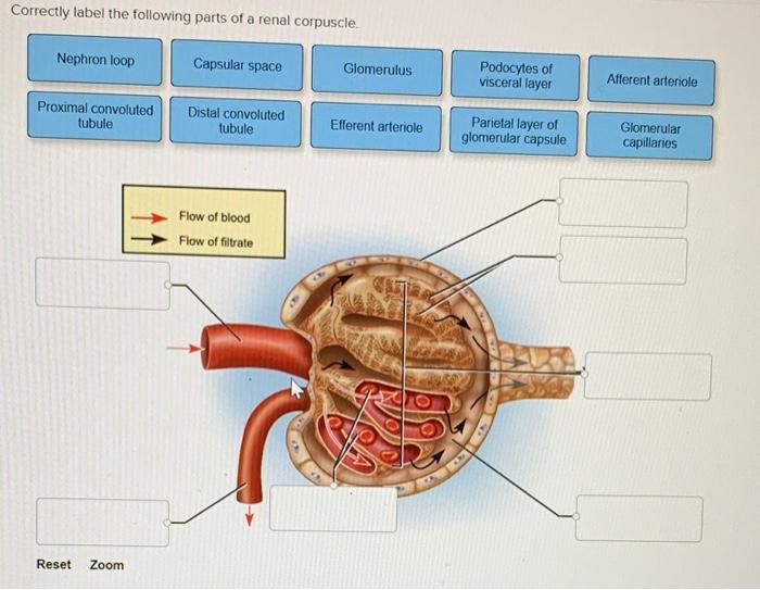 Solved Correctly label the following parts of a renal | Chegg.com Question: Correctly label the following parts of a renal corpuscle. Nephron loop Capsular space Glomerulus Podocytes of visceral layer Afferent arteriole Proximal convoluted tubule Distal convoluted tubule Efferent arteriole Parietal layer of glomerular capsule Glomerular capillaries Flow of blood Flow of filtrate Reset Zoom.