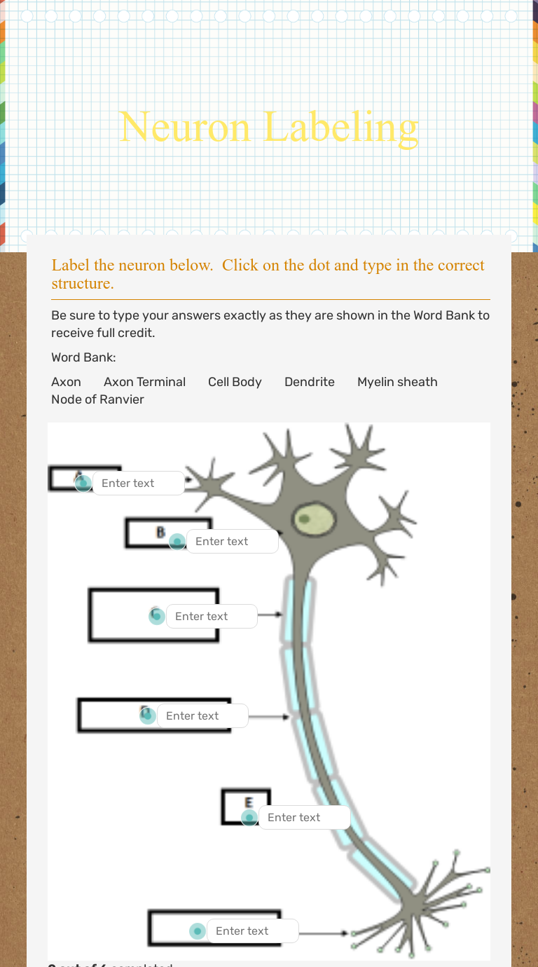 Neuron Labeling - Printable Download Worksheet Include correct answers on separate page About this Worksheet This is a free printable worksheet in PDF format and holds a printable version of the quiz Neuron Labeling. By printing out this quiz and taking it with pen and paper creates for a good variation to only playing it online.