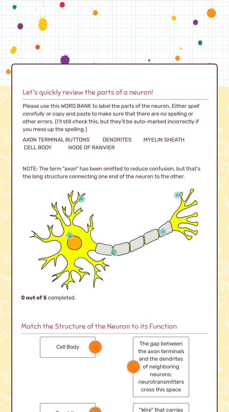 Label a Neuron - Printable - PurposeGames.com To play the game online, visit Label a Neuron Download Printable Worksheet Please note! You can modify the printable worksheet to your liking before downloading. Download Worksheet Include correct answers on separate page About this Worksheet This is a free printable worksheet in PDF format and holds a printable version of the quiz Label a Neuron.