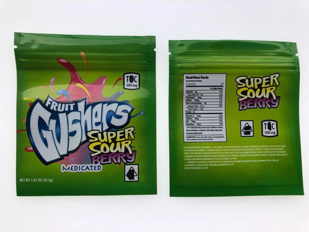 Fruit Flavored Snacks, Rockin' Blue Raspberry, Fruit Gushers, 6 ea NUTRITION LABEL (% of daily value based on 2000 calories per day) Nutrition Facts. Fruit Flavored Snacks, Rockin' Blue Raspberry, Fruit Gushers, 6 ea. Serving Size: pouch (25g) * Amount Per Serving ; Calories: 90 cal : Calories from Fat: 9 cal % Daily Value : Total Fat: 1 g : 2%: Saturated Fat : 0.6 g : 🔒% Cholesterol: