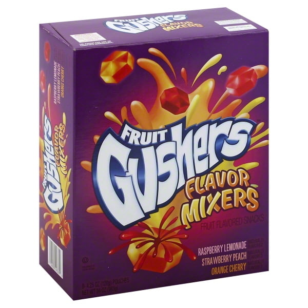 Gushers Fruit Flavored Snacks, Variety Pack, Strawberry and Tropical ... Nutrition facts. Refer to the product label for full dietary information, which may be available as an alternative product image. 20 Servings Per Container. Serving Size 1 pouch (23g) ... Gushers have a juicy center that bursts open with delicious fruity flavored liquid. Enjoy delicious Gushers Fruit Flavored Snacks, filled with Strawberry ...