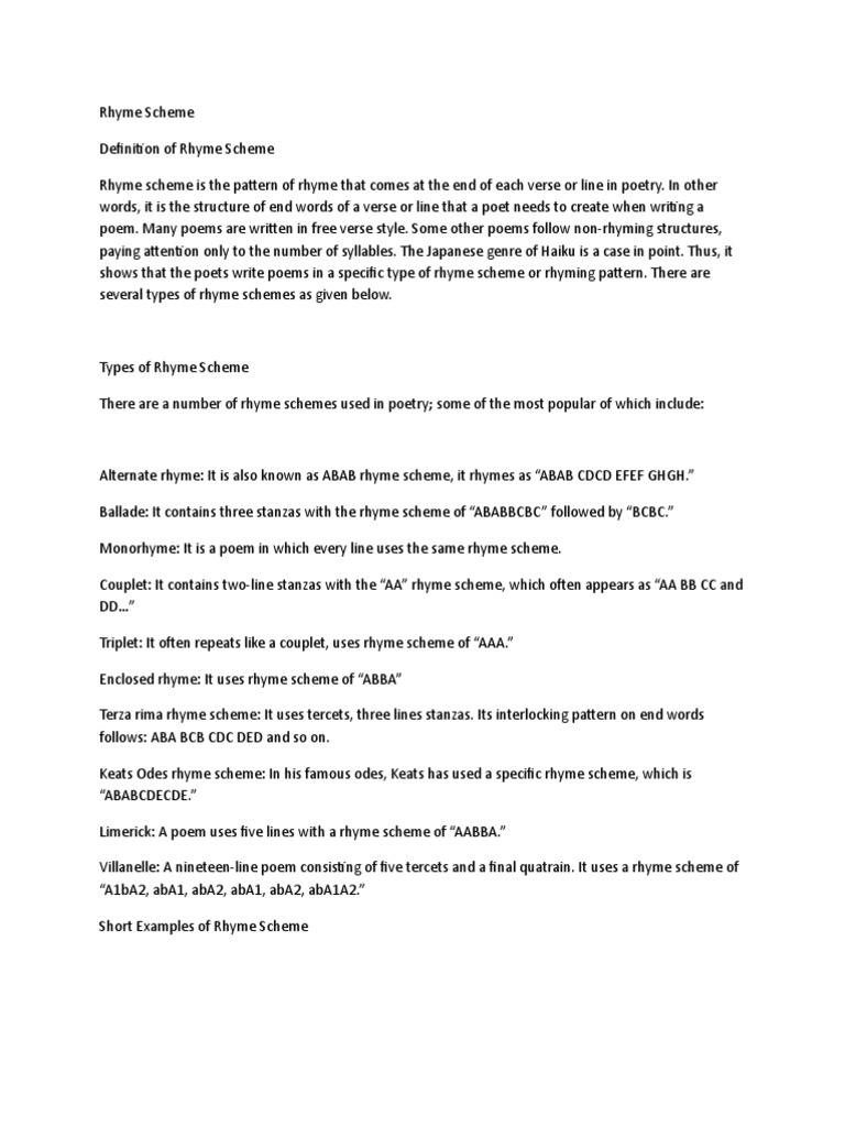Rhyme Schemes - A Poetry Lesson Plan - Poetry4kids.com A "rhyme scheme" is a way of describing the pattern of end rhymes in a poem. Each new sound at the end of a line is given a letter, starting with "A," then "B," and so on. If an end sound repeats the end sound of an earlier line, it gets the same letter as the earlier line.