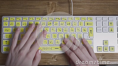 Close-up of a computer keyboard with braille. A blind girl is typing words on the buttons with her hands. Technological