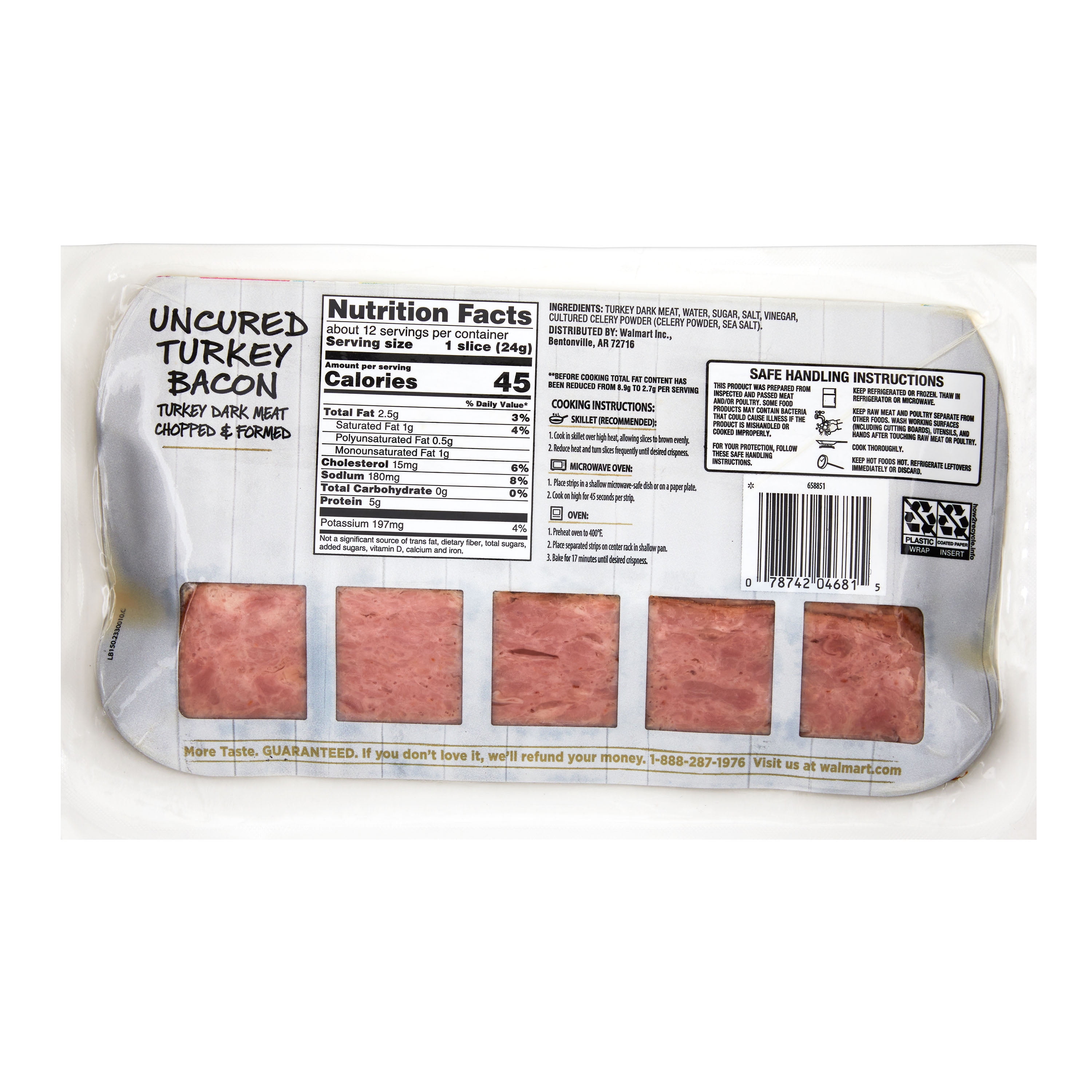 Turkey Bacon - COLUMBUS® Craft Meats Sweet & Smoky COLUMBUS® Turkey Bacon is wood-smoked over hickory or applewood chips and seasoned so you get the rich flavor you expect from bacon, made leaner with real turkey thighs. This bacon is uncured (contains no added nitrates or nitrites) and just like bacon, you need to cook it before enjoying it. Where to buy No Sellers Found Available in Sam's Choice Uncured Turkey Bacon, 10 oz - Walmart.com Sam's Choice Uncured Turkey Bacon contains slices of turkey thigh meat chopped, formed and naturally smoked with real hardwood. It is minimally processed with no artificial ingredients, preservatives or added nitrites and nitrates. It provides 5g protein per serving and contains 70% less fat than USDA data for uncooked pork bacon making it a ...