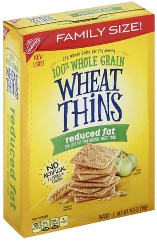 Nabisco Wheat Thins Reduced Fat Crackers Family Size Nabisco Wheat Thins Reduced Fat Crackers Family Size 12.5 oz $4.61 ($0.37/oz) Icon details Product description Discover the delicious 100% whole grain crunch of toasted Wheat Thins snacks. Reduced Fat Wheat Thins are toasted instead of fried and contain 30% less fat than original Wheat Thins — making them a smart snack choice for any occasion.