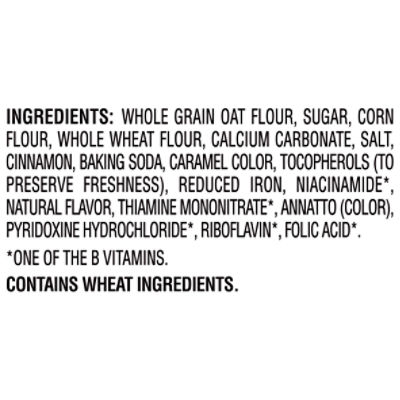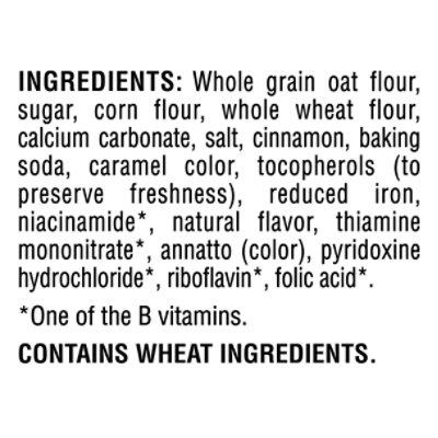 Quaker Cinnamon Life Cereal: calories, nutrition analysis & more ... Whole grain oat flour, sugar, corn flour, whole wheat flour, rice flour, calcium carbonate, salt, cinnamon, disodium phosphate, caramel color, reduced iron, niacinamide, zinc oxide, dextrin, yellow 6, BHT (a preservative), yellow 5, red 40, natural flavors, thiamin mononitrate, pyridoxine hydrochloride, riboflavin, folic acid, blue 1. 1 Comments