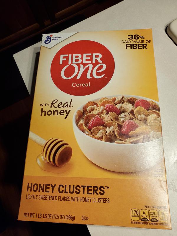Fiber One Honey Clusters Cereal Nutrition Facts - GroceryNutrition.org There are 170 calories in a serving of Fiber One Honey Clusters Cereal. Most of those calories come from carbohydrates (86%). ... Fiber One Honey Clusters Cereal contains the following ingredients: Whole grain wheat, oat cluster (whole grain oats, rice flour, sugar, brown sugar, corn syrup, honey, whole grain rice, salt, barley malt extract ...