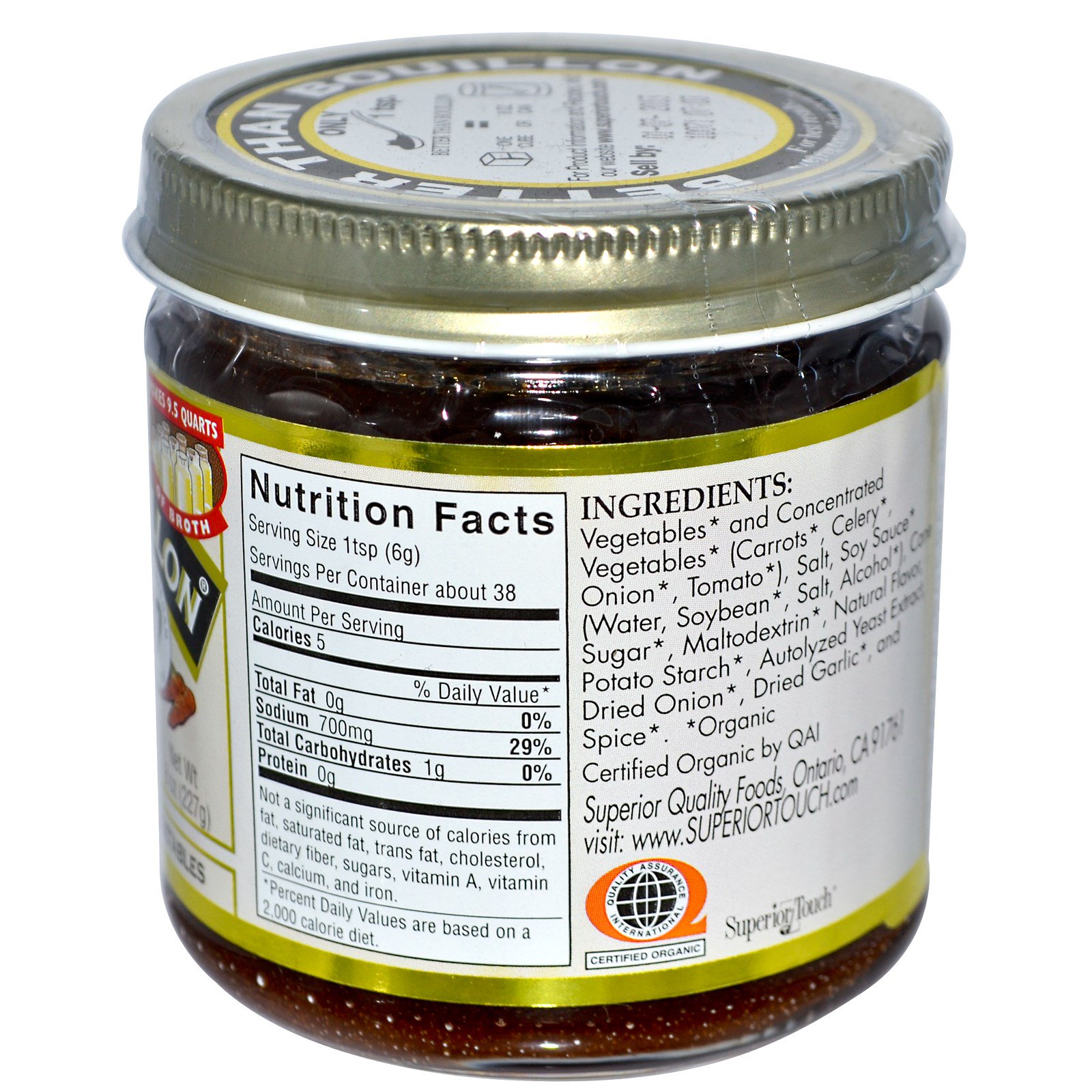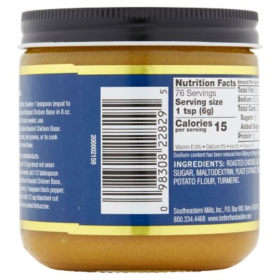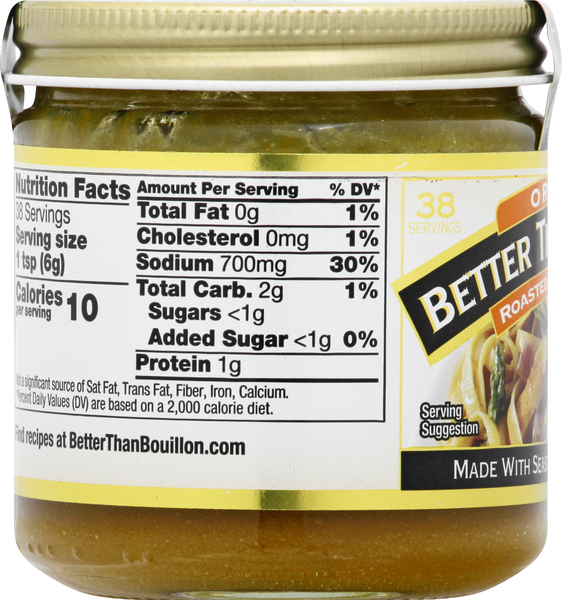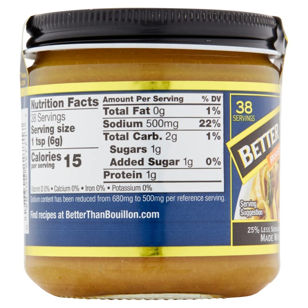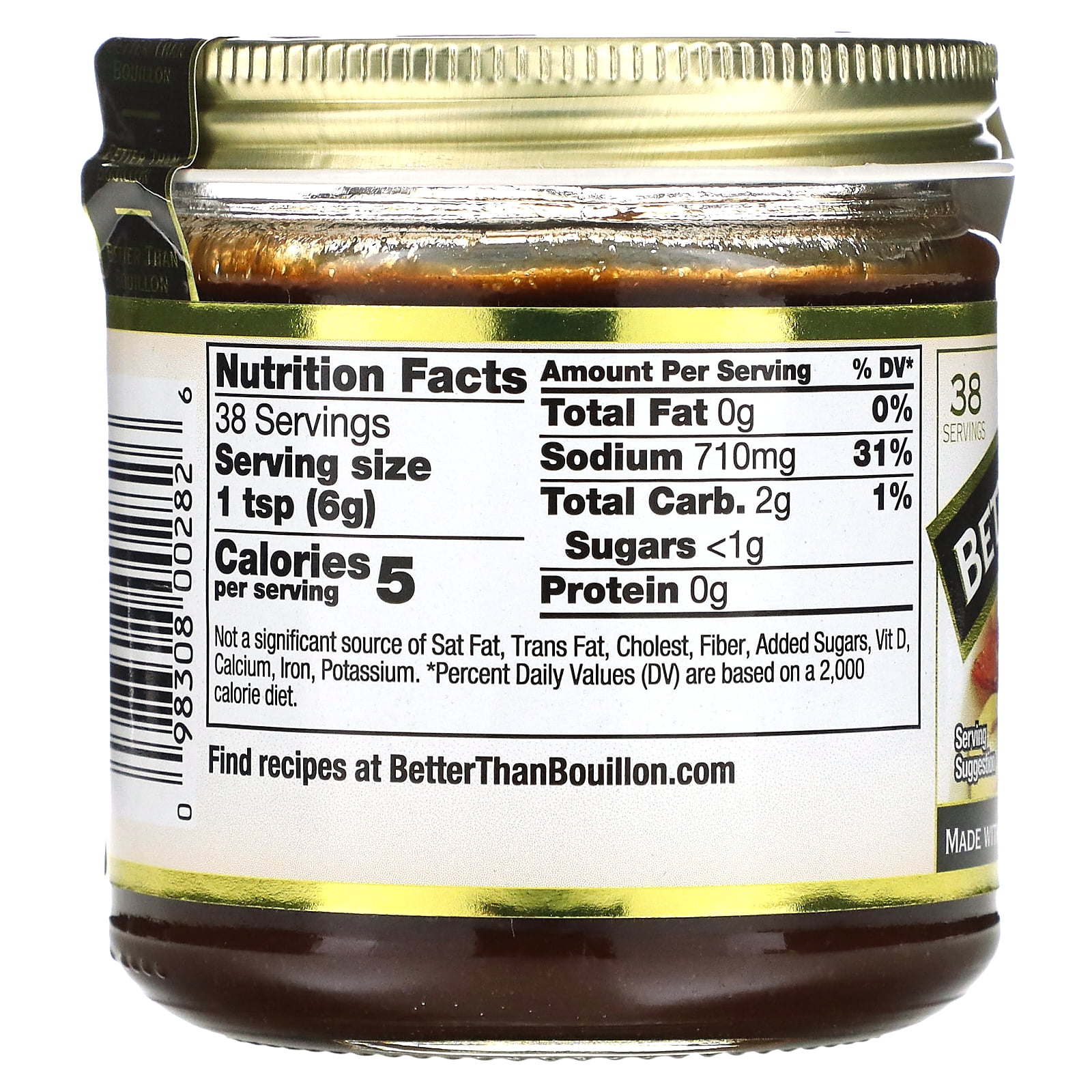 › brand › better-than-bouillonBetter Than Bouillon Nutrition Facts. Calories, carbs, fat ... Get nutrition information for Better Than Bouillon items and over 200,000 other foods (including over 3,500 brands). Track calories, carbs, fat, sodium, sugar & 14 other nutrients. › ourOur Products - Better Than Bouillon There’s more than one way to make food better. Better Than Bouillon bases are available in a wide variety of flavors made with only premium ingredients. They’re a great-tasting, high-quality way to get creative with your cooking and enhance everything from soups to grilling. Try them all and find your favorite – or ten. › products › roastedRoasted Chicken Base - Better Than Bouillon Ingredients ROASTED CHICKEN, SALT, SUGAR, CORN SYRUP SOLIDS, HYDROLYZED SOY PROTEIN, DRIED WHEY (MILK), FLAVORING, FOOD STARCH, DISODIUM INOSINATE AND DISODIUM GUANYLATE, TURMERIC. ALLERGENS: MILK, SOYBEANS. Nutrition Facts Serving Size: 1 tsp Servings (per 8 oz container): 38 10 Calories Amount % Daily Value 0 g Total Fat 1% 680 mg Sodium 30%
