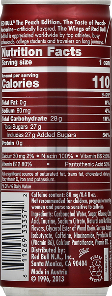 Red Bull Energy Drink Nutrition Facts (Detailed) - REIZECLUB For the short answer, a usual 8.4 fl.oz can of Red Bull has 110 calories, 27g of sugar, and 80mg of caffeine in it, along with a handful of sodium, 1g of taurine, and various B-Vitamins. For a deeper dive into the nutritional value of a can of Red Bull and how it affects you nutritionally, stick around….