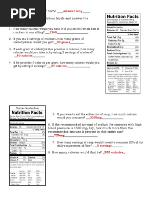 NutritioN label worksheet name ____answer key_____ Examine the ... Examine the following nutrition labels and answer the questions. 1. How many calories would you take in if you ate the whole box of crackers in one sitting? ___ ...
